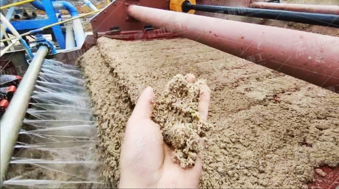 2、擦洗機擦洗后的物料進入到螺旋洗砂機進行清洗,清洗后的物料通過兩道洗脫一體機洗砂并脫水,隨后成品砂通過傳動帶運至成品堆場。