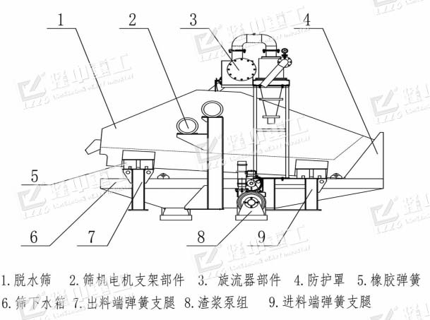 脫水部分:由振動(dòng)電機(jī)和脫水篩組成,洗砂機(jī)的成品物料直接進(jìn)入脫水篩進(jìn)行二次清洗、分級(jí)和脫水。