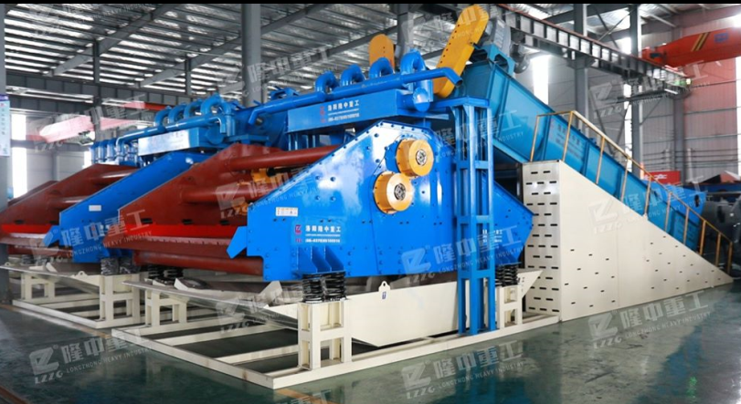 經過破碎篩分后的物料進入螺旋洗砂裝置,清洗之后合格物料將進入后端尾礦干排裝置進行脫水,由于固體物粒大小的不同,比重不同,所以液體中的沉降速度不同,細顆粒浮游在水中成溢流出,粗顆粒沉于槽底,由螺旋洗砂一體機的螺旋推向上部排出,同時利用水力和機械力使礦石碎散并擦洗礦石上的雜質和泥土,洗下礦石表面細泥并分離。旋流器的沉沙嘴位于尾礦干排篩的上方,形成濃縮后的物料落入尾礦干排篩,而旋流器分離的水體流入到回收水箱內部。其余廢水進入反水裝置排出,完成整個流程。